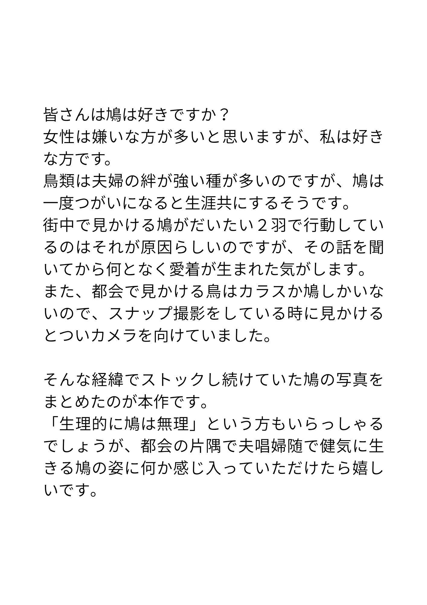 都会で見られる数少ない野鳥である鳩が写り込んでいるスナップ写真で構成されたデジタル写真集です。
