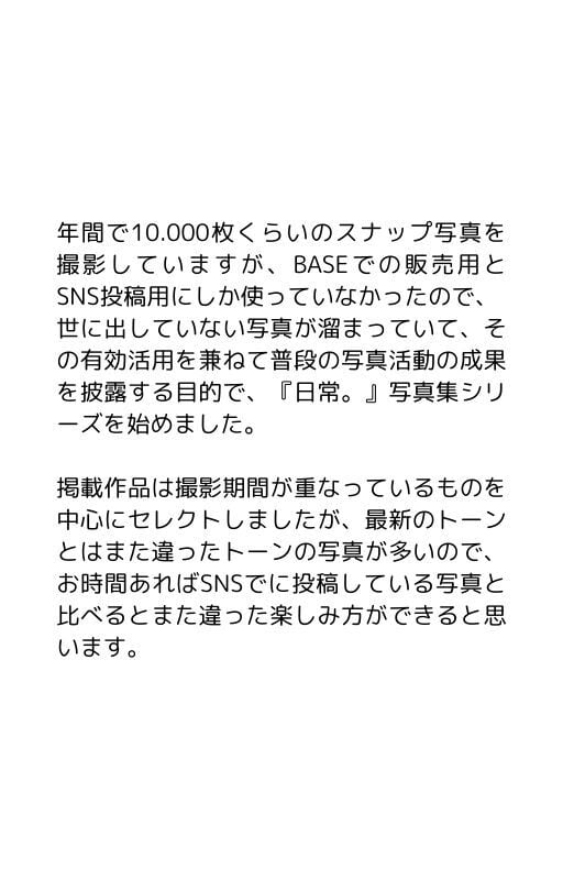 日常に埋もれた美しい空気を切り取ることを写真活動のテーマにしてきた私の活動報告書という位置付けの写真集『日常。』の4作目となります。