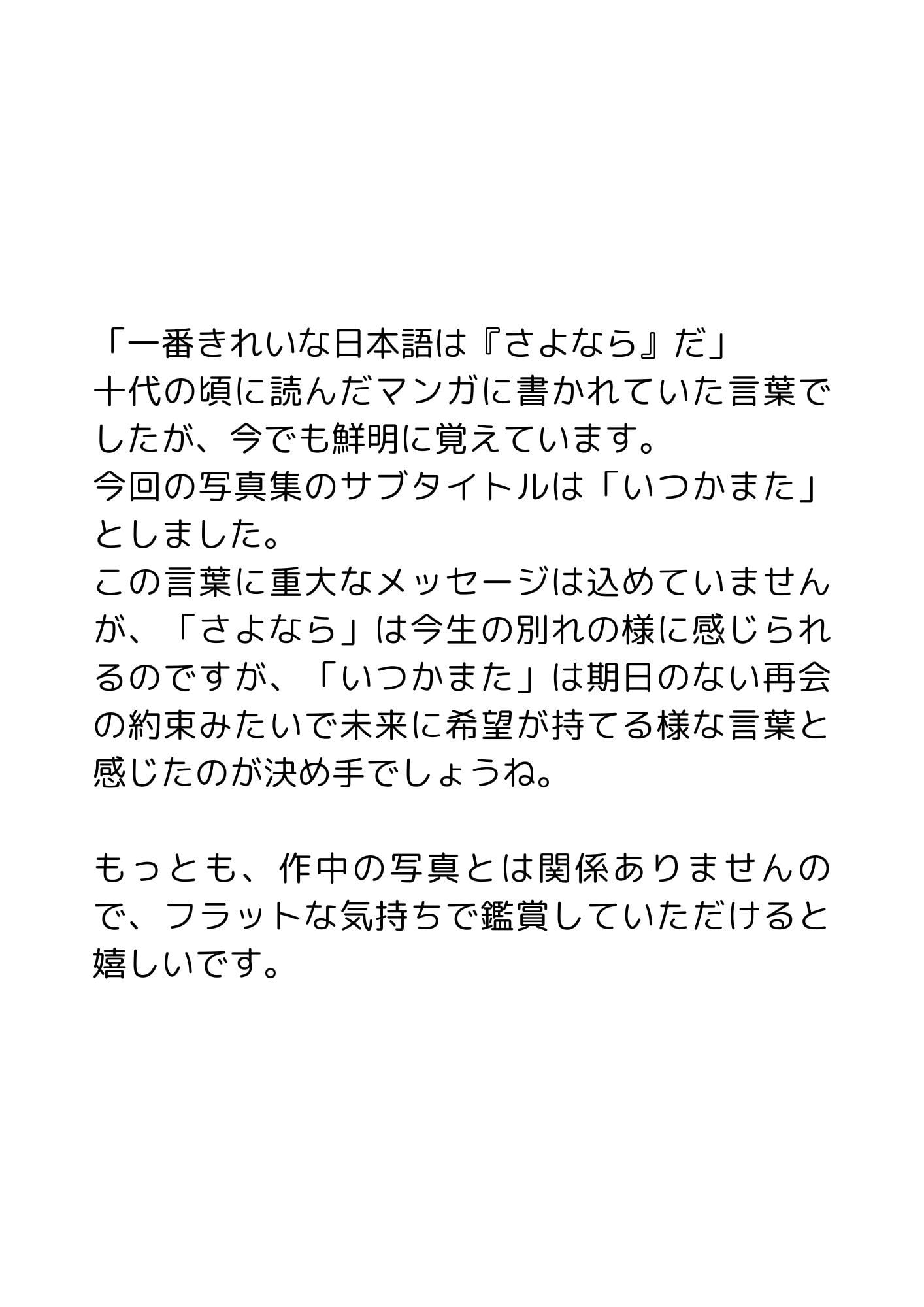 特別な場所の特別な時間ではない、ありふれた日常の風景の中にあなたの心の琴線に触れる作品があったら、この写真集の存在意義と私の写真活動の意味が生まれると思っております。